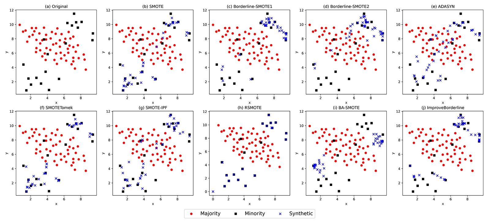 | 图2 不同采样方法在toy数据集上采样后数据分布情况 |
