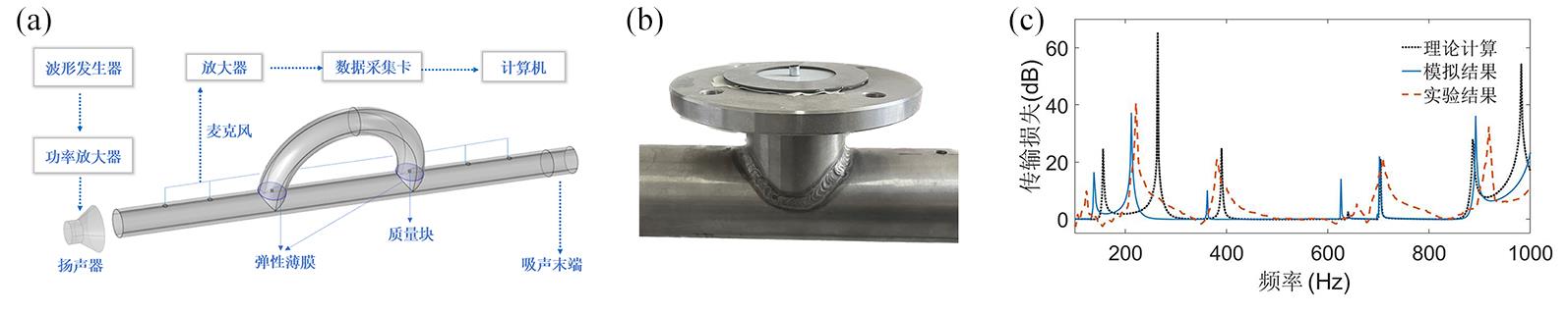 | 图4 (a)实验系统示意图;(b)附加质量薄膜实验图;(c)模拟结果和实验结果对比 (c) comparison of transmission loss between simulation and experimental results |