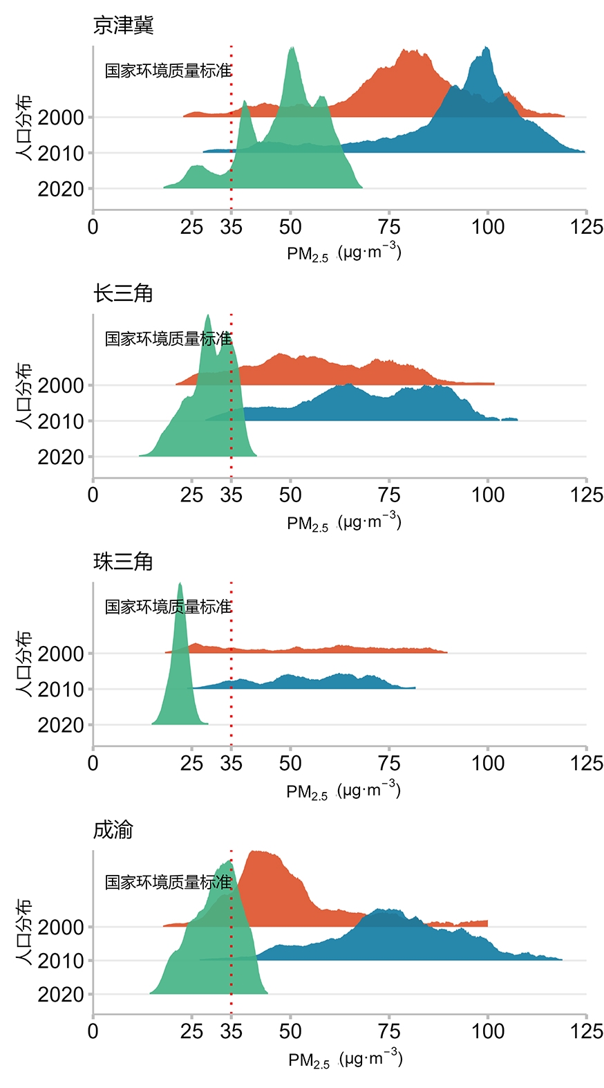 | 图3 2000,2010和2020年人群的PM2.5污染暴露分布 |