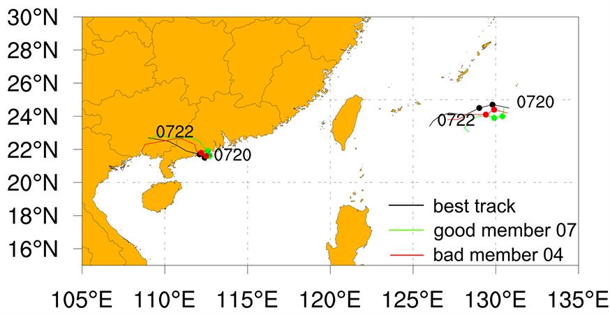 | Fig.10 The CMA typhoon best track and forecasted typhoon track of the good and bad members from 08:00 CST on 20 July to 08:00 CST on 22 July,with "Cempaka" on the left and "Infa" on the right |