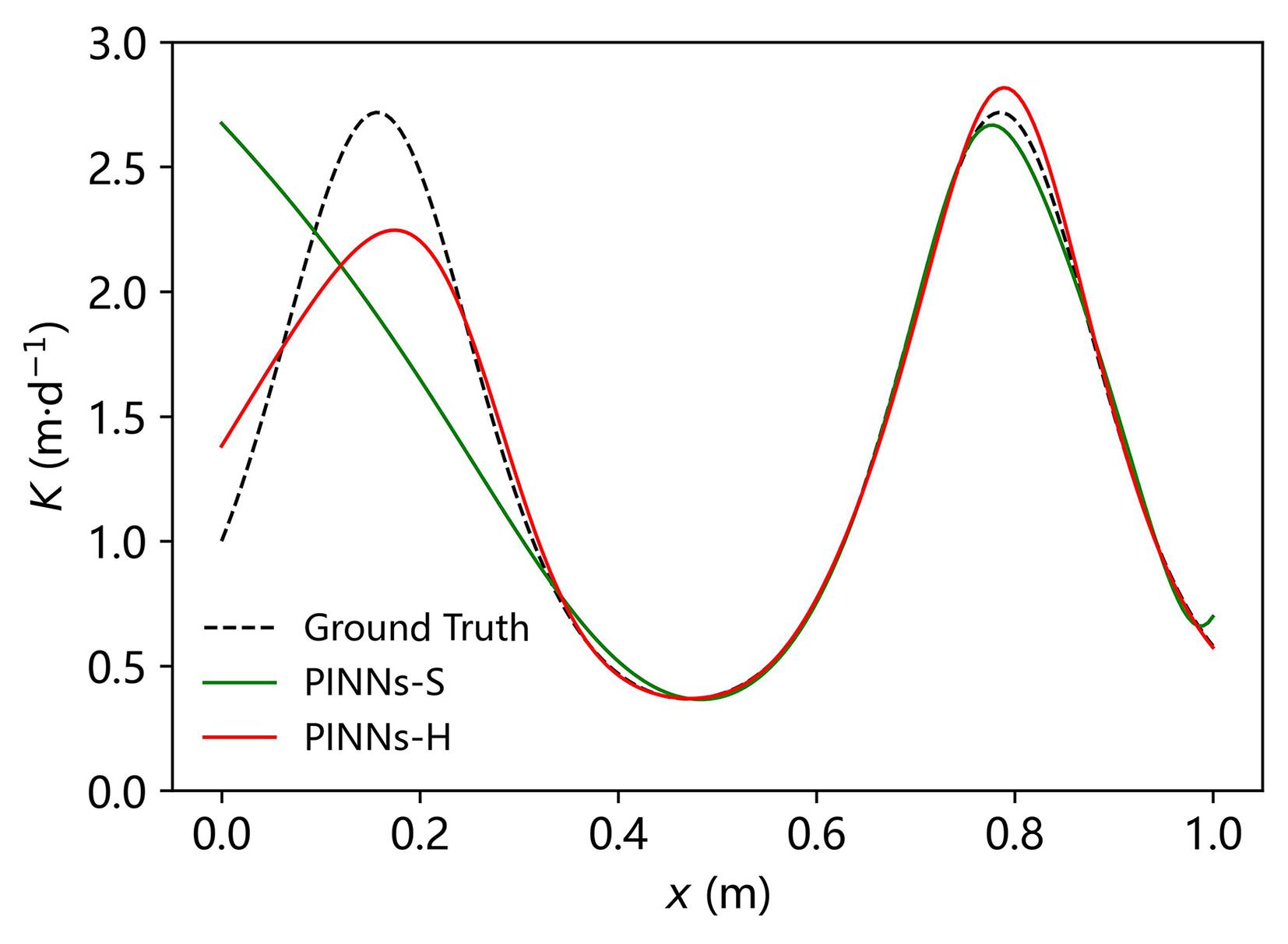 | 图4 一维稳态潜水流模型中PINNs软约束和硬约束算法反演渗透系数结果图 |